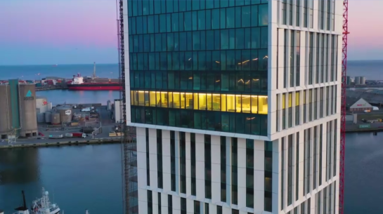 Det markante højhus Mindet på Aarhus Havn har nu passeret 100 meter, og facadeentreprisen er i fuld fremdrift.
