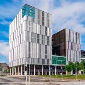 HSHansen har stået for levering og montage af de store glasfacader i profilsystemet HansenFasad, karruseldør samt døre og vinduer i farven sort anodiseret C35.