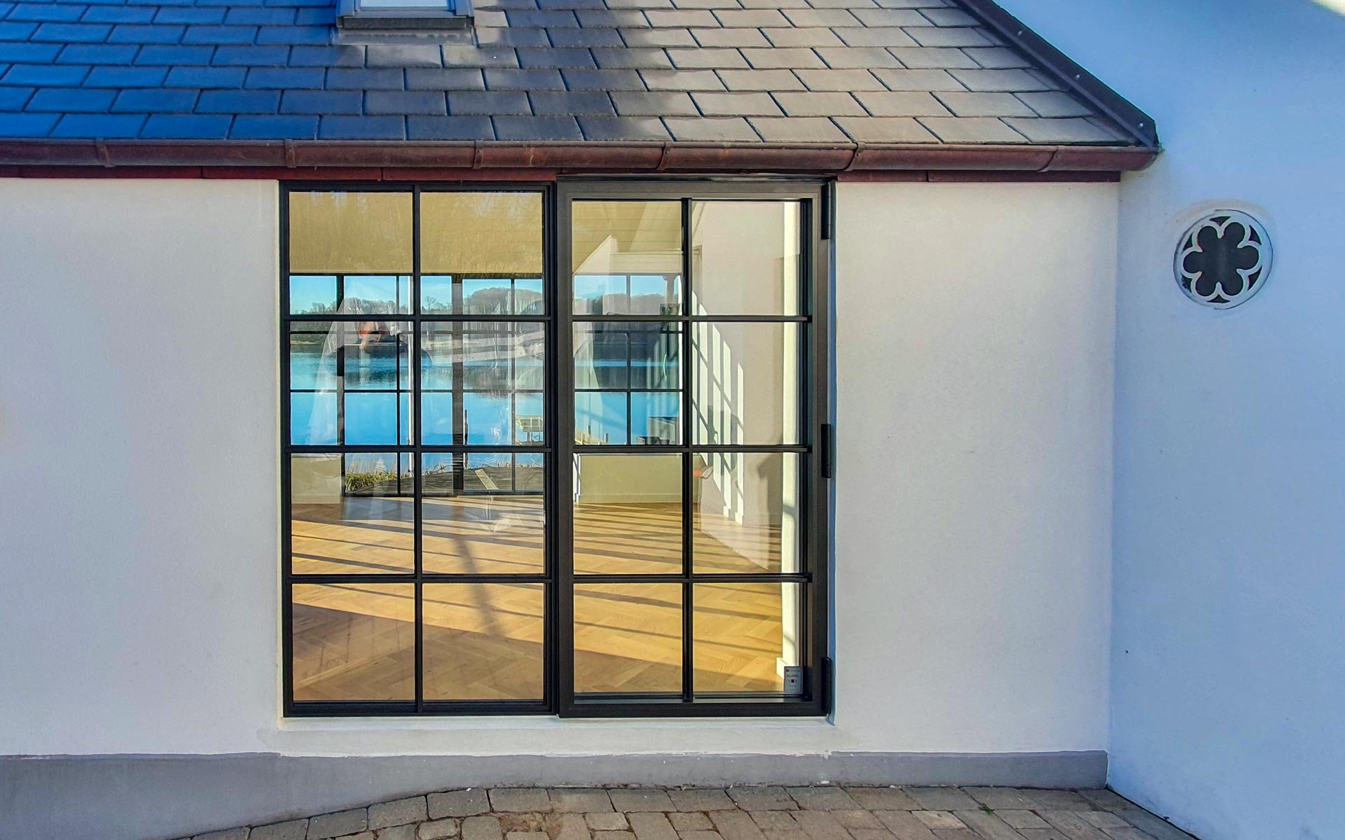 HSHansen har leveret vinduer og døre med 25 mm limsprosser i både 2-lags og 3-lagsglas i farven Noir 2100 Sablé.
