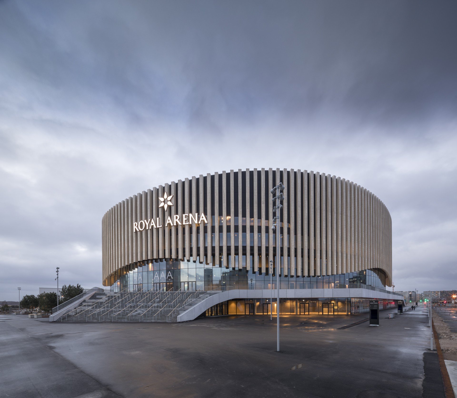 The architectural vision behind Royal Arena is divided into a plinth and a top. The top has a semi-transparent facade, where wooden fins in a warm golden color, waves on the building in a circular motion. The light elements of the exterior façade give a warmth and texture to the building; a character and identity that, although subtle from afar.